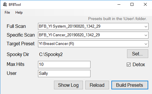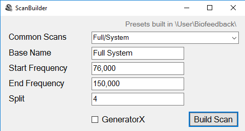 When you’ve set up previous fields the way you want them, click the Build Scan button to build the biofeedback presets. If successful, you will see the message “Presets built in \User\Biofeedback\”.