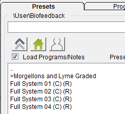 To see your biofeedback presets, in Spooky2, in the Presets tab, click on >User, then >Biofeedback. For the previous example, the Spooky Pulse biofeedback presets Full System 01 (C) (R), Full System 02 (C) (R), Full System 03 (C) (R), and Full System 04 (C) (R) were created.
