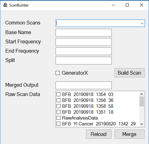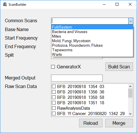 BFBTool can make custom biofeedback presets for both GeneratorX and Spooky Pulse. You typically will use the factory biofeedback presets under the >Biofeedback folder in the Presets tab of Spooky2, but sometimes you may want to customize the frequency range. For biofeedback presets that take a long time to scan, you can split via this utility the biofeedback preset into smaller sections that take less time to scan per section. After you finish scanning using all the preset sections, you can merge the section results into one large biofeedback raw scan data file for analysis as a single large scan.