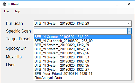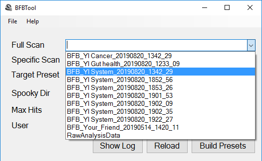After you’ve finished your system scan in Spooky2, bring up the BFBTool. Click on the down arrow on the combo box next to the Full Scan label, a menu will appear that has a list of the choices of biofeedback scan data files to choose (see the image to the right). Choose the newest system scan data file. If you don’t see your recent scans in the menu, click the Reload button to load the current contents of the database into the utility.