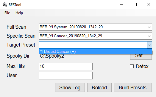 The Target Preset field is optional. This is useful for people who have fewer generators, and want to include programs from Spooky2 with their scan results in their presets. You create a preset in Spooky2 with the programs you desire, and save the preset in the User folder. If you don’t see your new preset in the Target Preset menu, click the Reload button and try again.