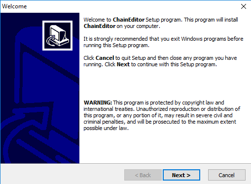 Once the installer for ChainEditor installer appears, click the Next > button until you see the panel with the Finish button, and click Finish.
