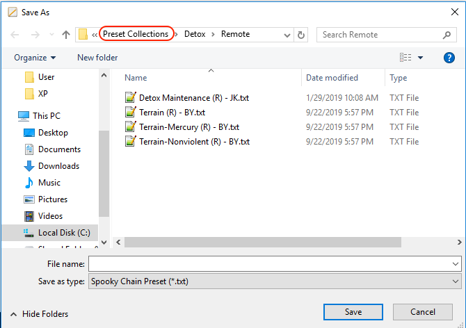 In the File menu, click on Save As… to open the Save As dialog. Note that you are currently in the Presets Collections > Detox > Remote folder. Click on Preset Collections to navigate to the Preset Collections folder. Then double-click User to open the User folder. The Save As dialog is shown below.