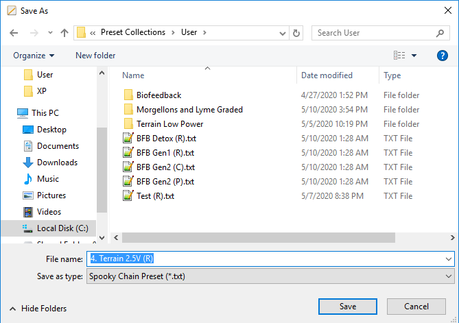 After I arrive in the User folder, I type a new name, in this case 4. Terrain 2.5V (R), and click the Save button.