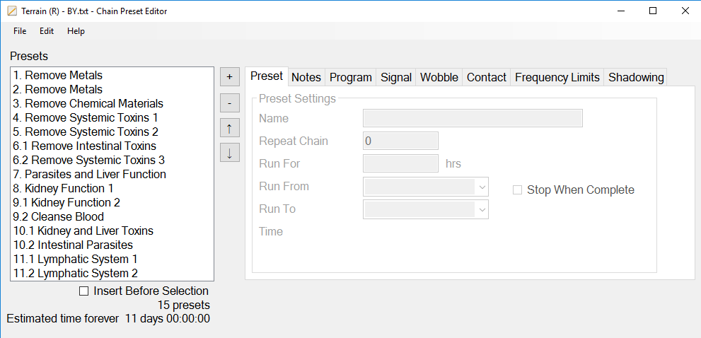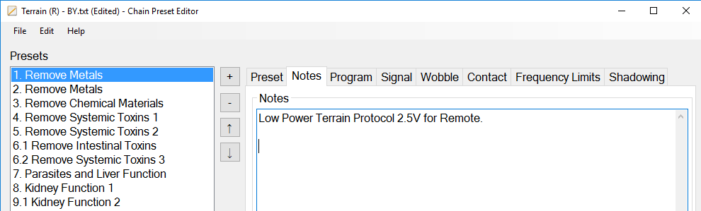 In an earlier post Low Power Terrain Presets, you could download presets for a low power Terrain protocol preset, which is useful for people who are too sensitive to bear the detox and herxing that they experience with the normal Terrain protocol preset. Using ChainEditor, you will learn how you can make your own low power preset with the Amplitude that works best for you.