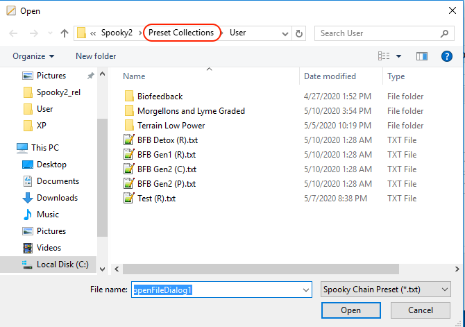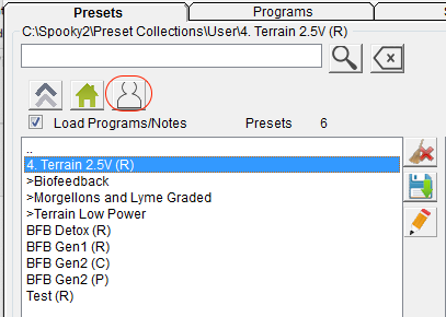 Now in the Spooky2 Presets tab, I click on the Go to User directory button (circled in red below), and I see my new preset 4. Terrain 2.5V (R).