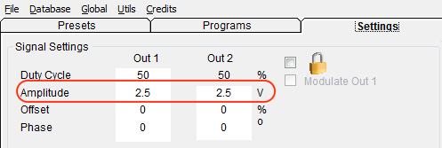 Now click on the Signal tab, and change the Amplitude for Out 1 and Out 2 from 5 volts down to 2.5 volts.