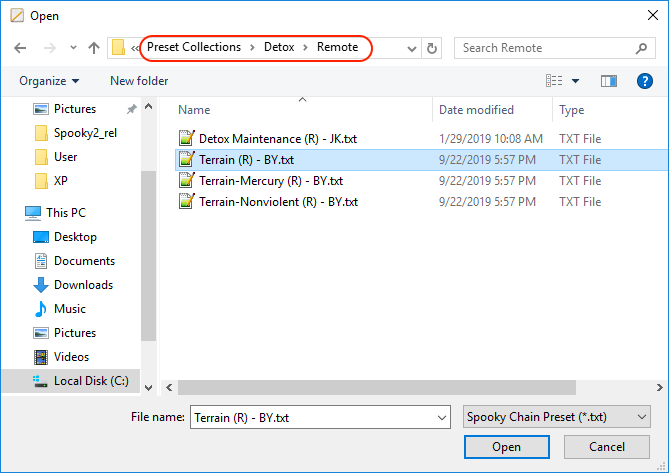 At this point, double-click the Detox folder, then double-click the Remote folder. The double-click Terrain (R) – BY.txt.