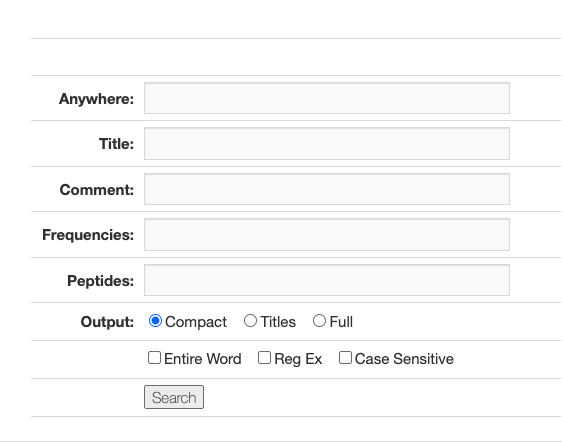 In this tool, you can most often just use the Anywhere field to search for some text. This field will search all the different parts of the peptide program — the title, the front comment, the frequencies, and the list of peptides at the end of the program. However, you can also search specific parts of the programs too.