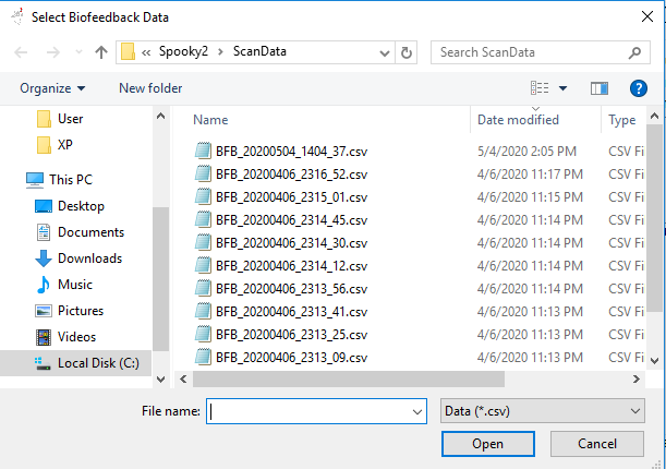 This brings up the Select Biofeedback Data dialog. The raw scan data files usually contain the date in the form YYYYMMDD_HHmm_SS (Y=year, M=month, D=day, H=hour, m=minutes, S=seconds). Choose your raw scan data file and click the Open button.