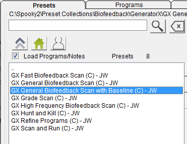 First, you must load up the Control tab with the preset you originally used to do the scan. So let’s say you used GX General Biofeedback Scan with Baseline (C) – JW. Go into the Presets tab, find you scan preset, and click on it.