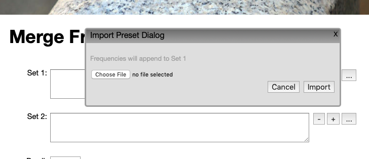 The “…” button next to the Set 1 text field will bring an Import Dialog that can be import frequencies from a Spooky2 preset into the Set 1 field. Similarly, the “…” button next to the Set 2 text field can import frequencies into the Set 2 field.