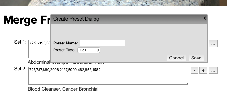 In 2016, I introduced a tool called mergesets, that allows you to specify different programs for Out 1 and and Out 2. mergesets creates the necessary codes to merge two separate frequency sets so that one set can be output on Out1 of the Spooky-XM generator, and the other frequency set can be output on Out2 of the same Spooky-XM generator. The image below is the state of the tool after you click the “+” button to the right of the Set 1 text field.