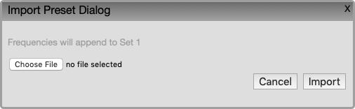 Clicking Cancel or the close box will close the Import Dialog. Click the Choose File button (this button may have a different name, like Browse) to select a Spooky2 Preset. Or if you had previously selected a preset before and the preset’s name is already displayed, you can click the Import button.