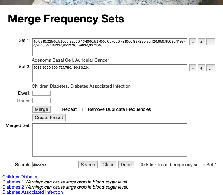 Type a pattern into the Search field, and type the Enter key or click on the Search button. If your search pattern matches a frequency set in the Spooky2 database, the results will be displayed below the Search field. Clicking on one of the search result links will append that frequency set into either the Set 1 or Set 2 text field, based on which “+” button you last clicked. Next to the Done button is a hint telling which text field will receive the frequency set you specify.
